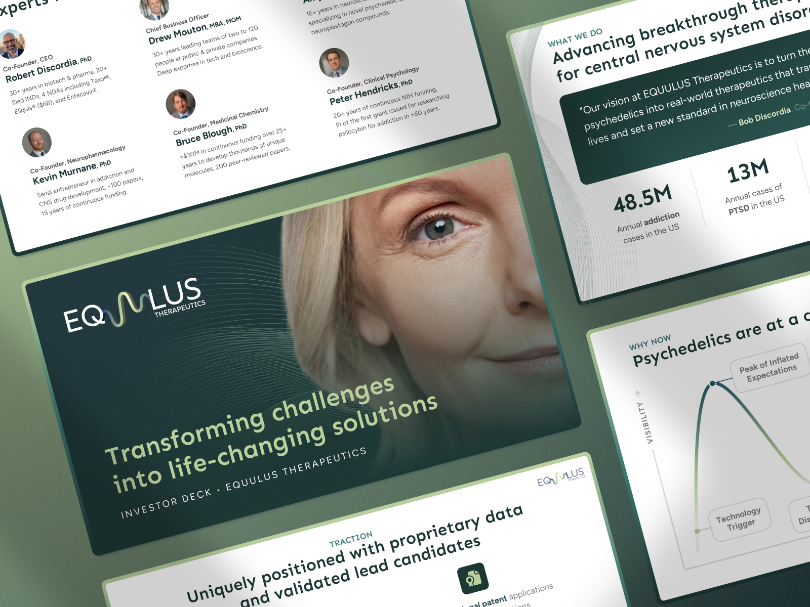 Here’s a look at the pitch deck designed for Equulus Therapeutics, used to raise capital to fund drug development and clinical trials.
